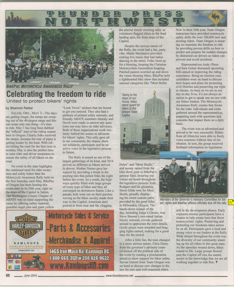 May 2015 – Our May Motorcycle awareness rally was a big success, featuring Representative Andy Olson, Representative Sara Gelser, Senator Betsy Close, and Team Oregon Director Steve Garets, who came to support our campaigns to promote motorcycle safety, awareness, and education.